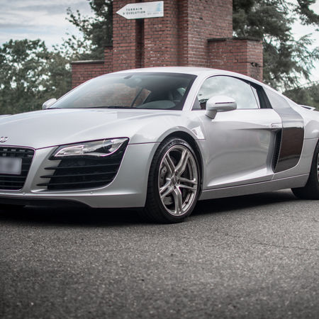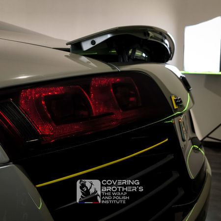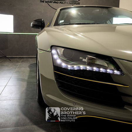 La R8. Ce véhicule tant apprécié par les amateurs de véhicules de sport et de prestige. Total covering khaki green sur ce modèle avec des touches de noir brillant et de jaune ainsi que les feux fumés avant et arrière...