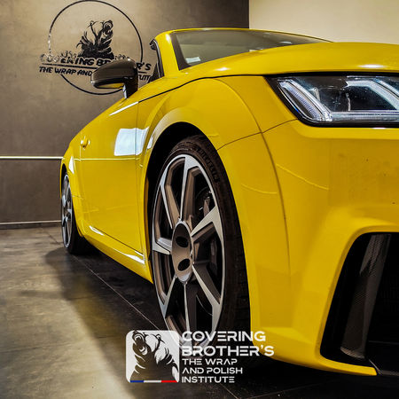 Du covering carbone un peu partout mais surtout...un total covering jaune très brillant pour cette TTRS de base gris anthracite. Pour une finition parfaite notre client a opté pour le covering des intérieurs de portes également...