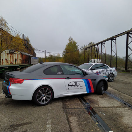 Total covering pour cette M3 en gris mat et blanc brillant dont la séparation des couleurs se fait par les couleurs Motorsport...