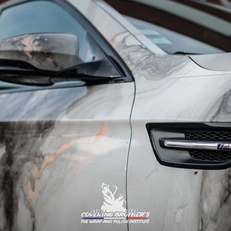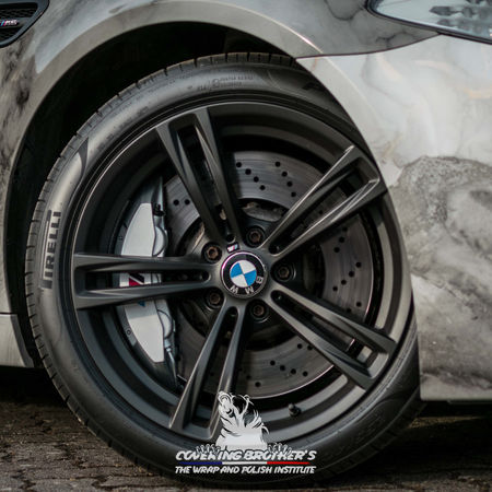 Cette M5 a deux personnalités. C'est une véritable berline familiale confortable qui cache bien un caractère brutal et sportif. Son covering sur mesure en imprimé dans un esprit marbré a lui aussi deux faces, une claire et une obscure...