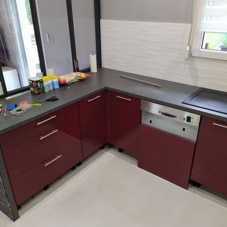 Cette cuisine bénéficié d'un covering blanc brillant pour remplacer son rouge bordeaux d'origine comme vous pouvez le constater sur ces photos.